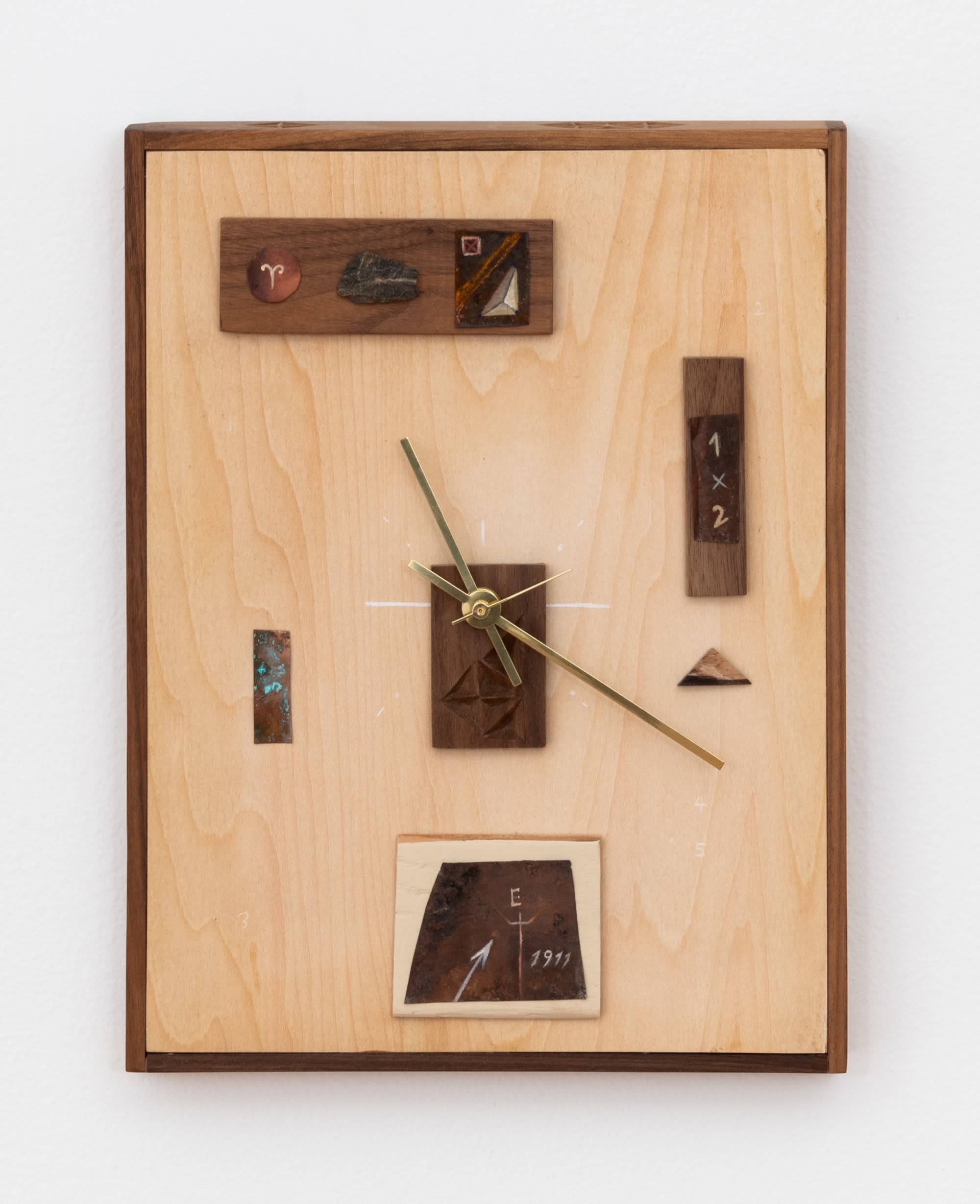 Hand-carved walnut, oil on tin, graphite on wood, second hand, quartz clock movement