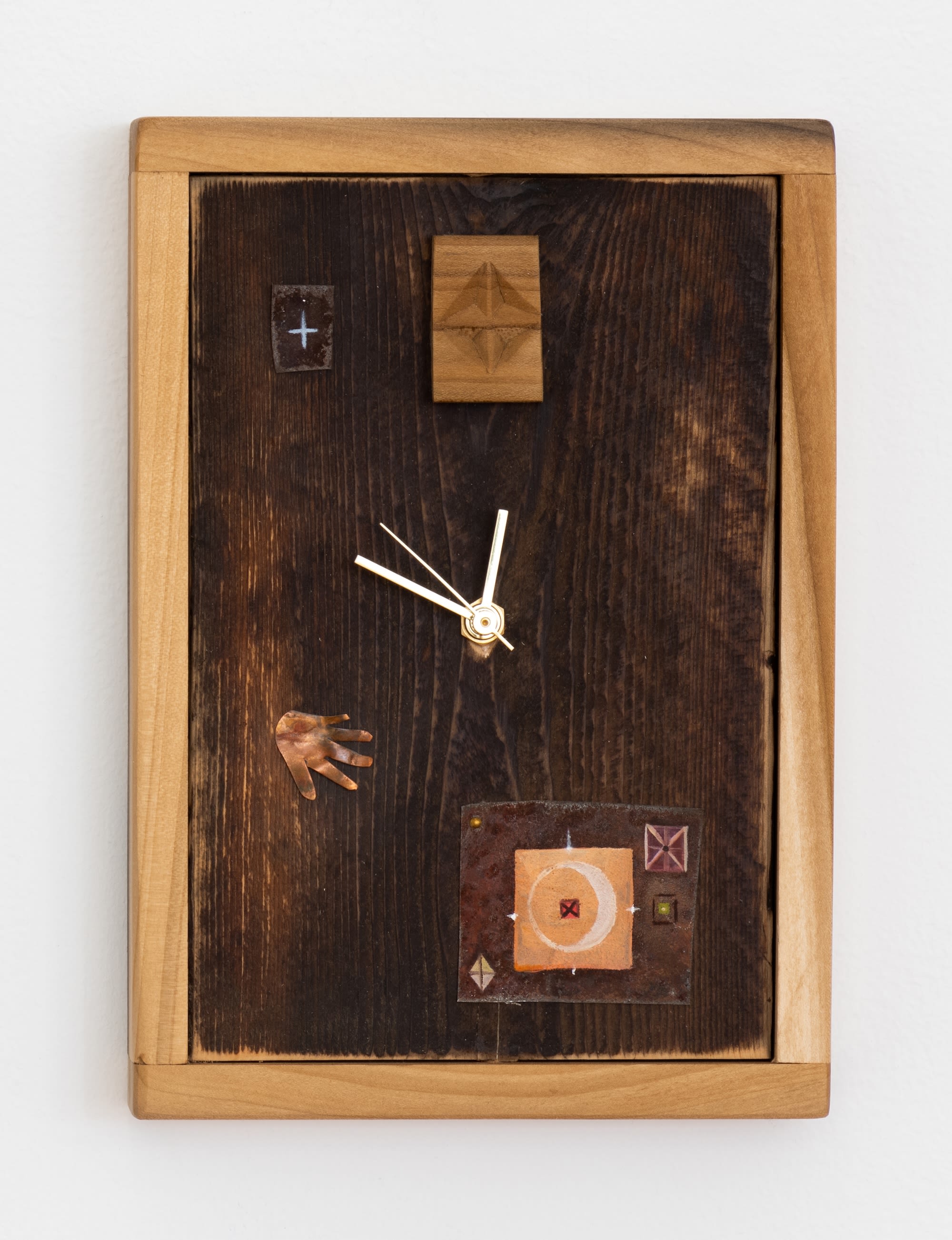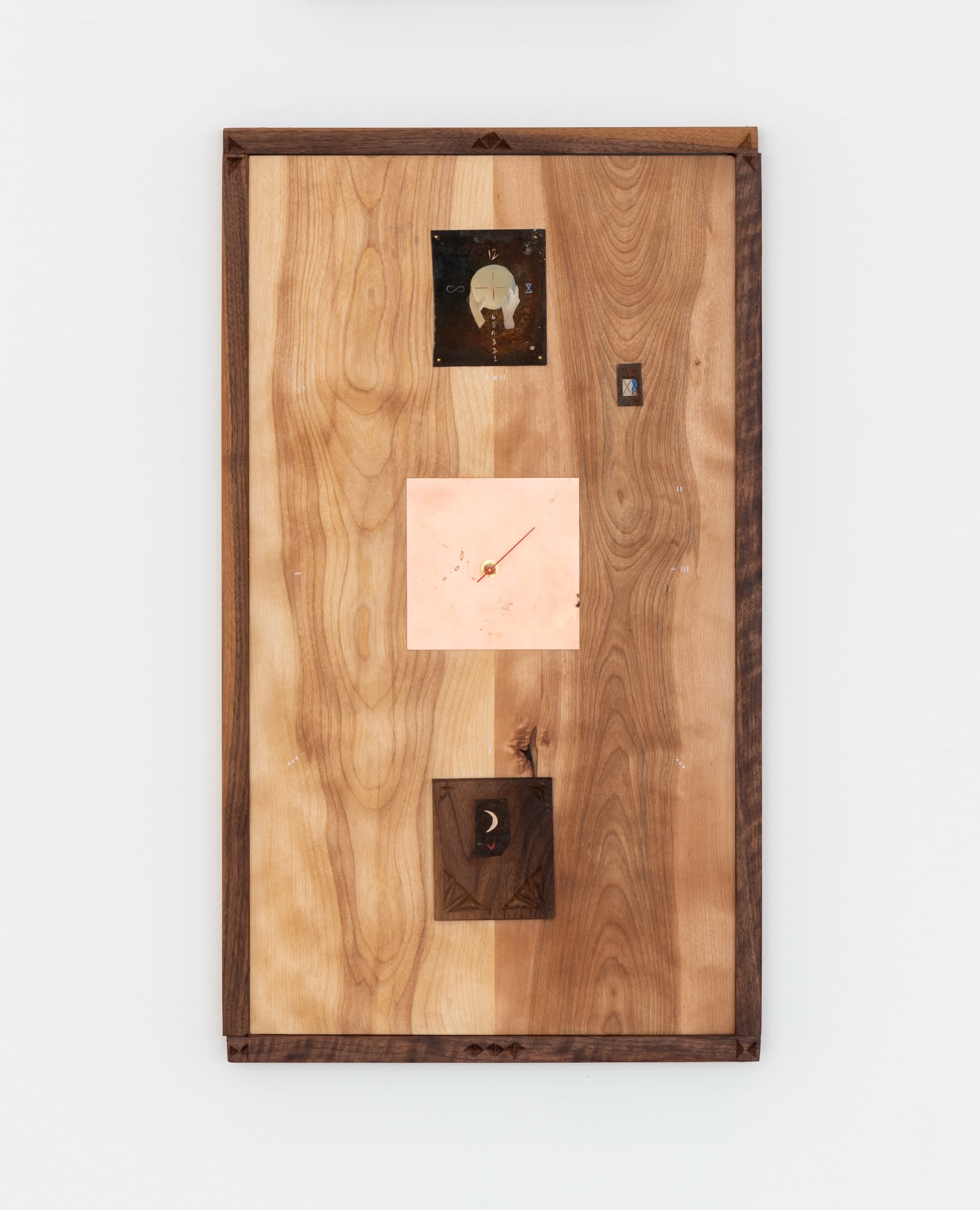 Hand-carved walnut, oil on tin, house paint, copper, rock, second, minute, and hour hands, and quartz clock movement on panel