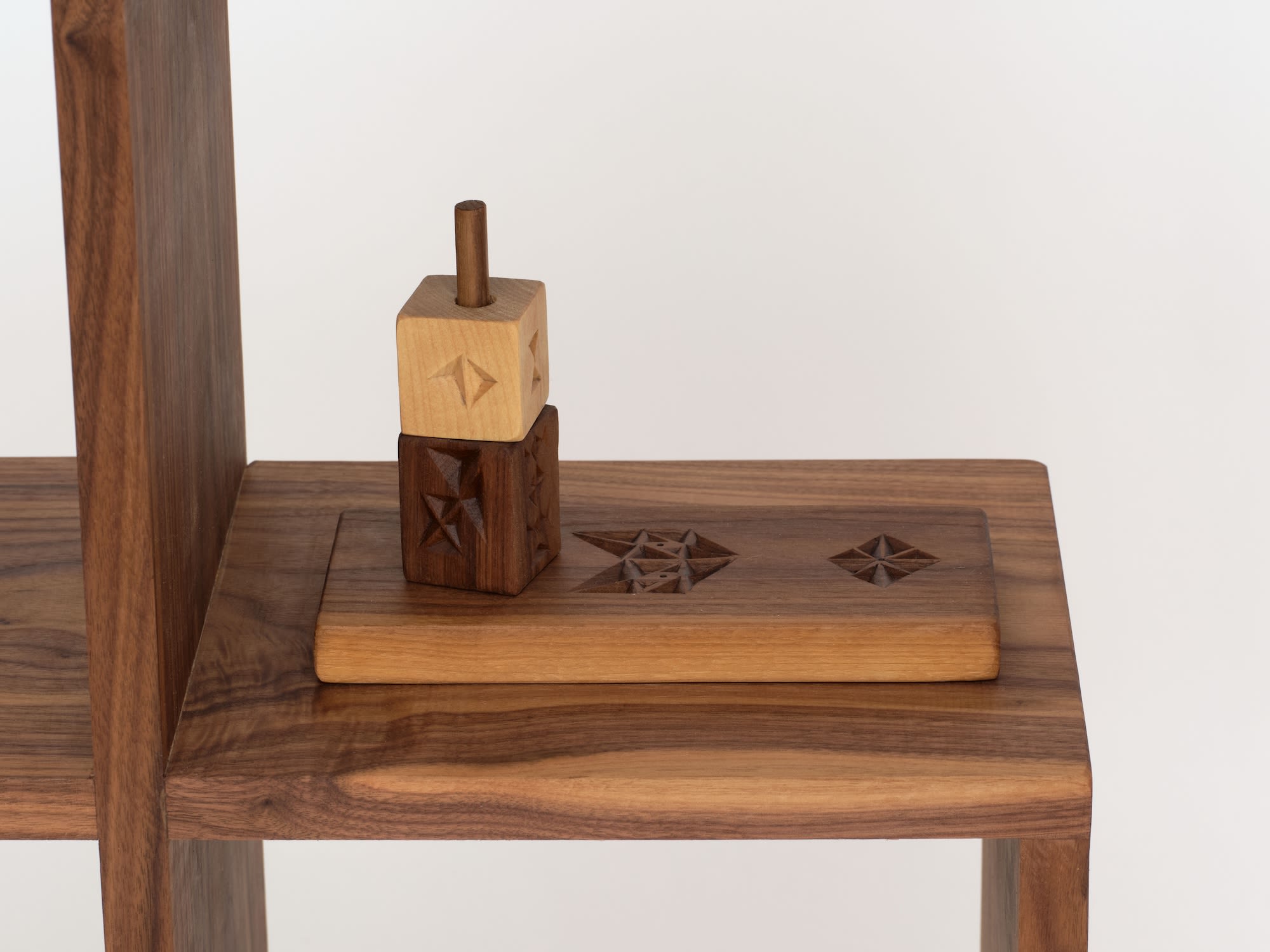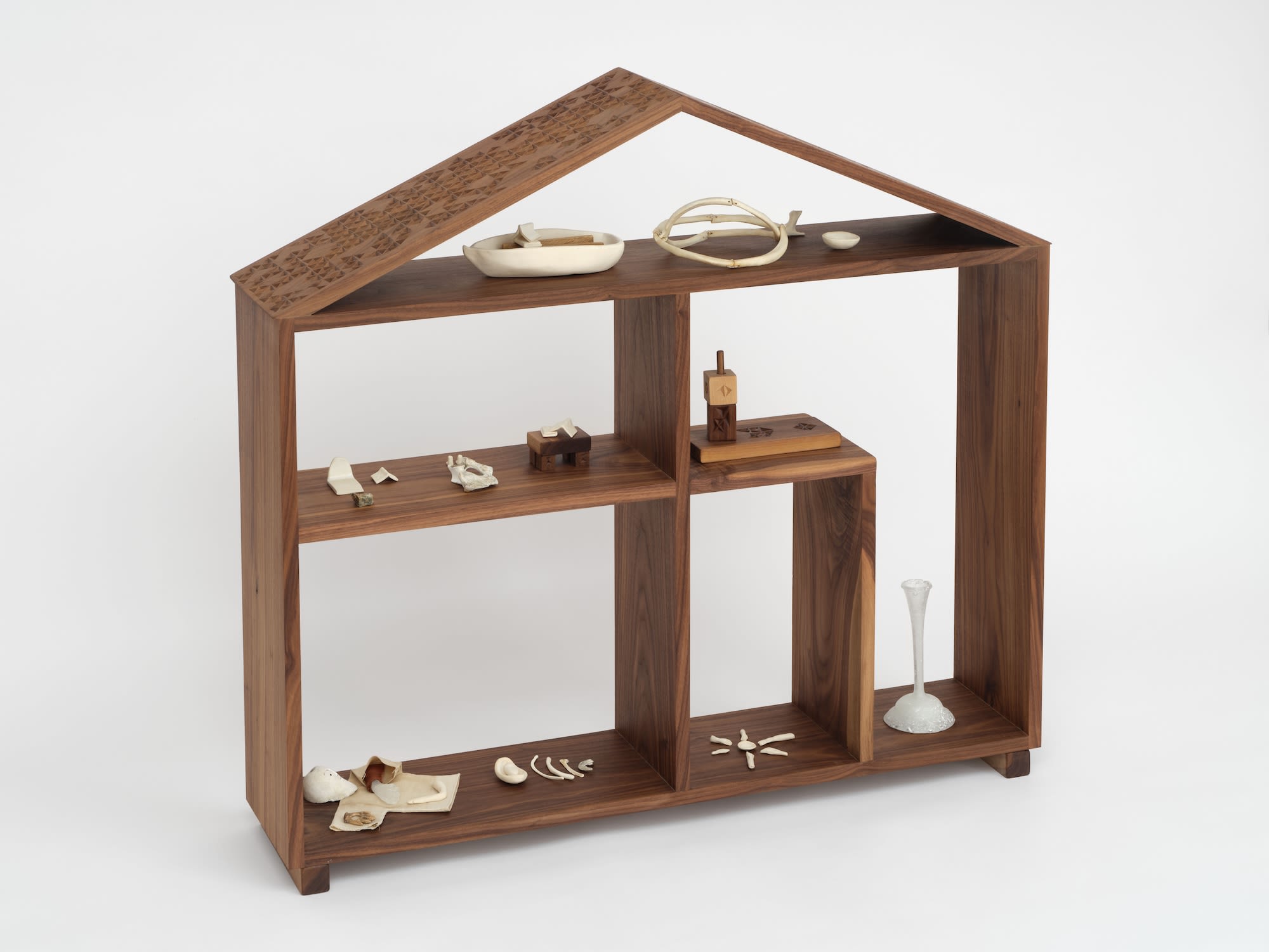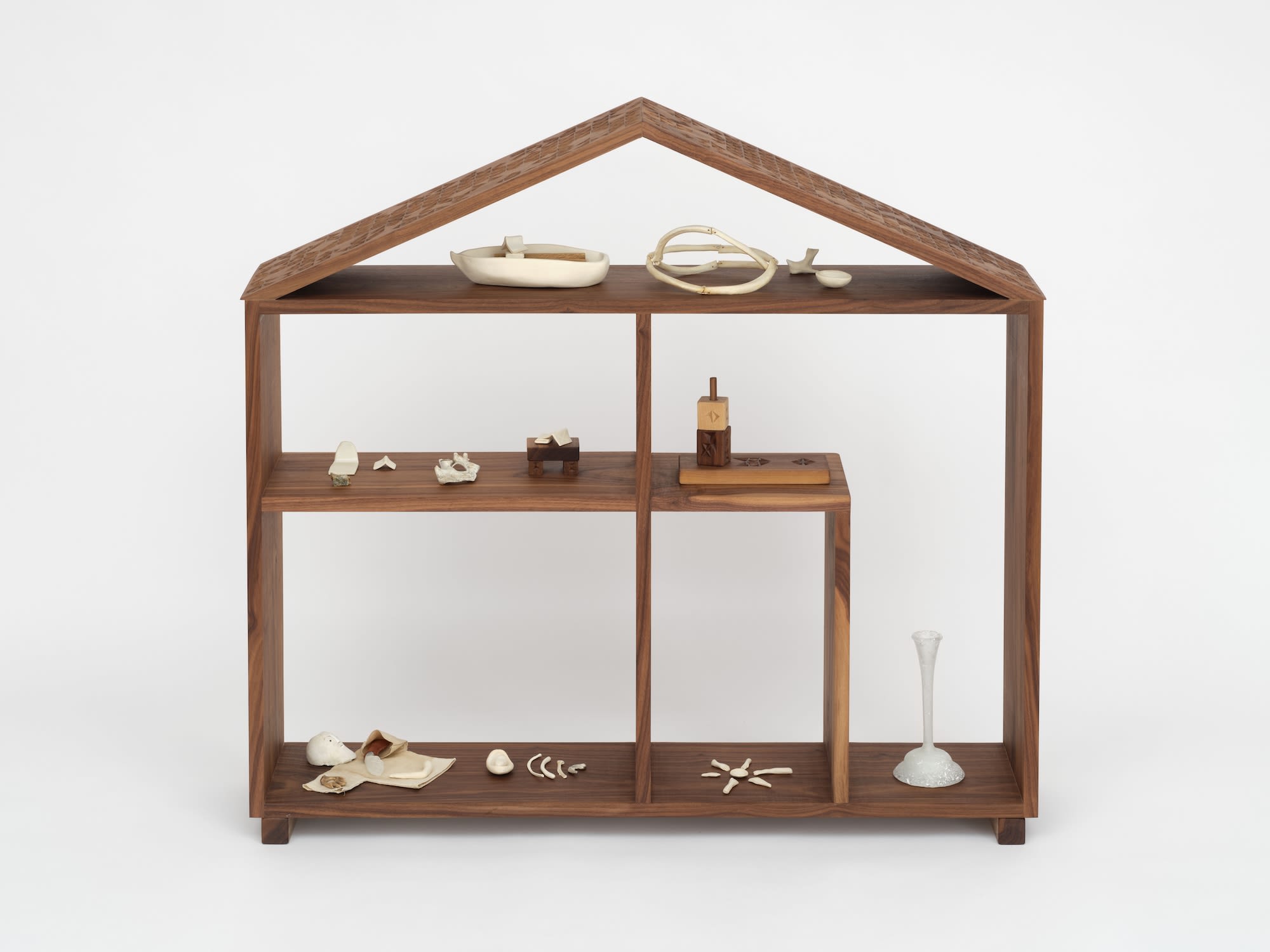 Hand-carved walnut, oil, bone, ceramic, wire, kiln-cast glass, linen, thread, soil, pine tool, serpentinite, bronze, silver