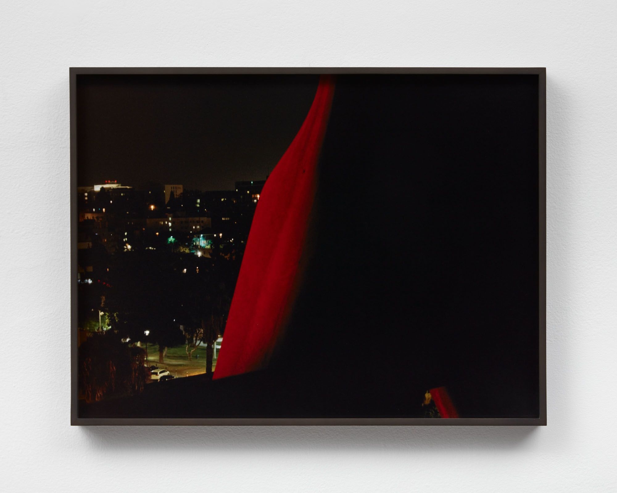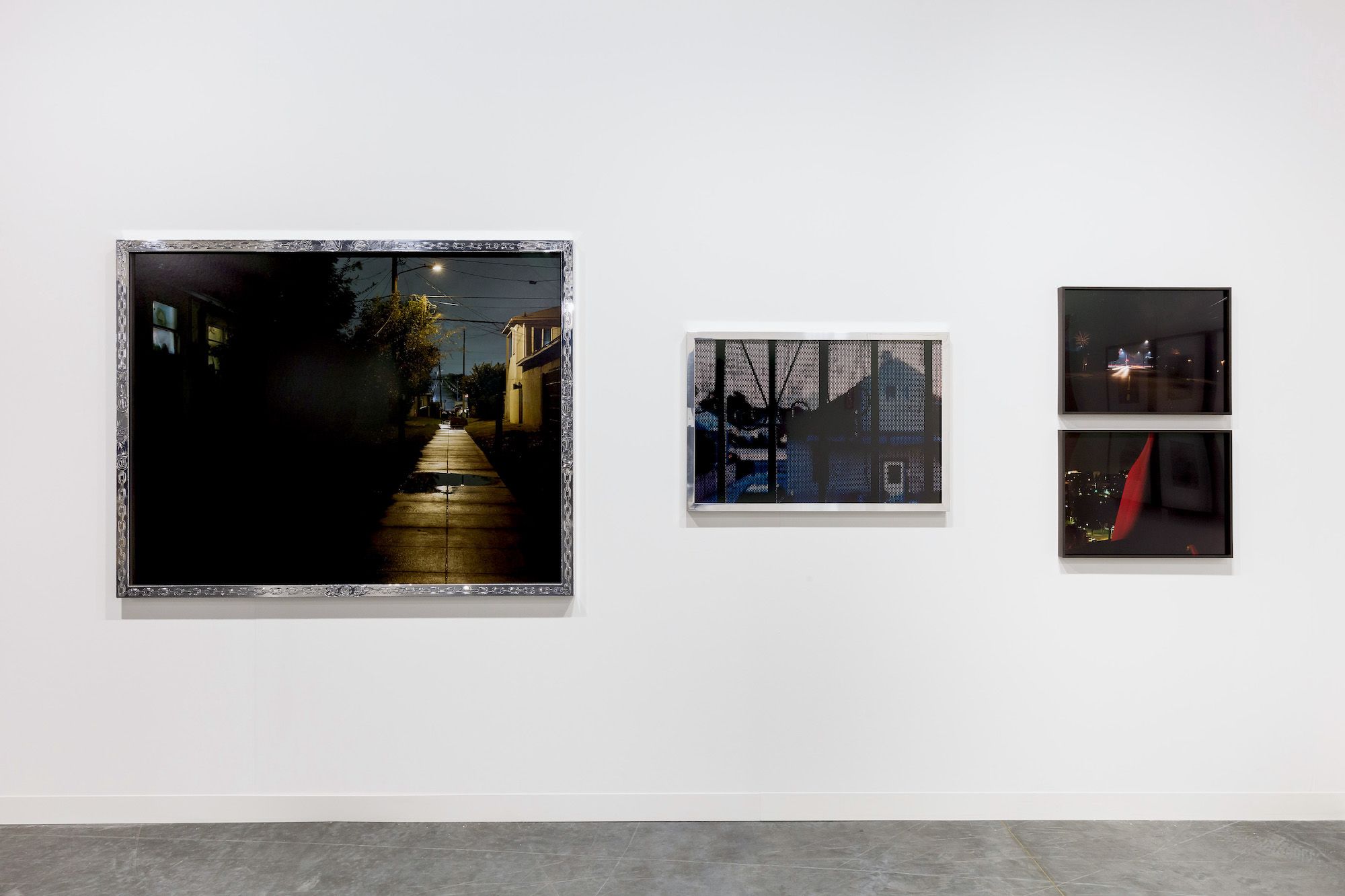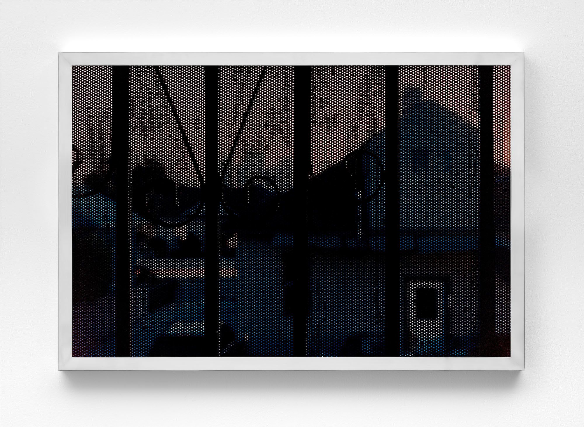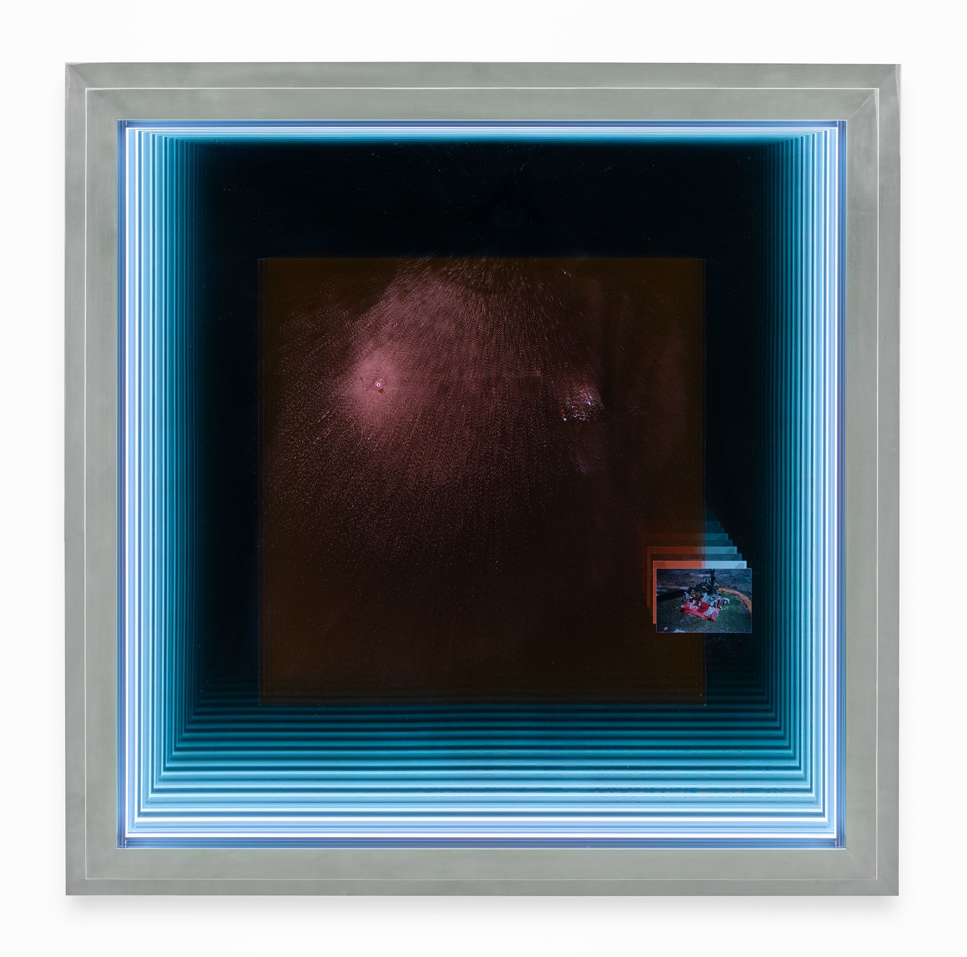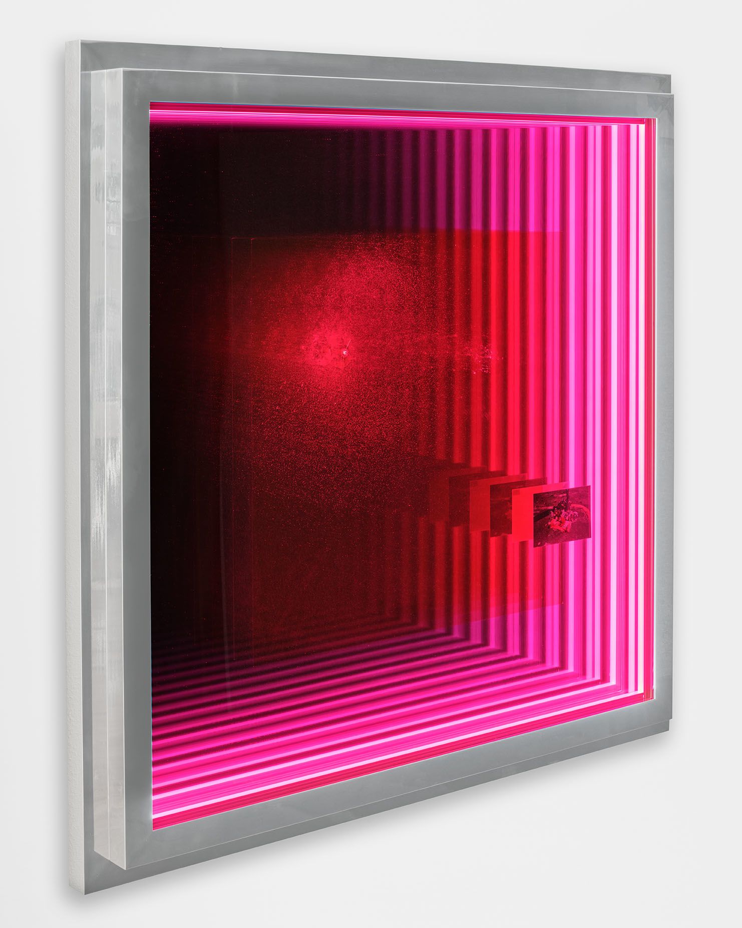 Polished aluminum, glass, mirror, two-way mirror, bullet, colored gel, archival pigment print, LED lights