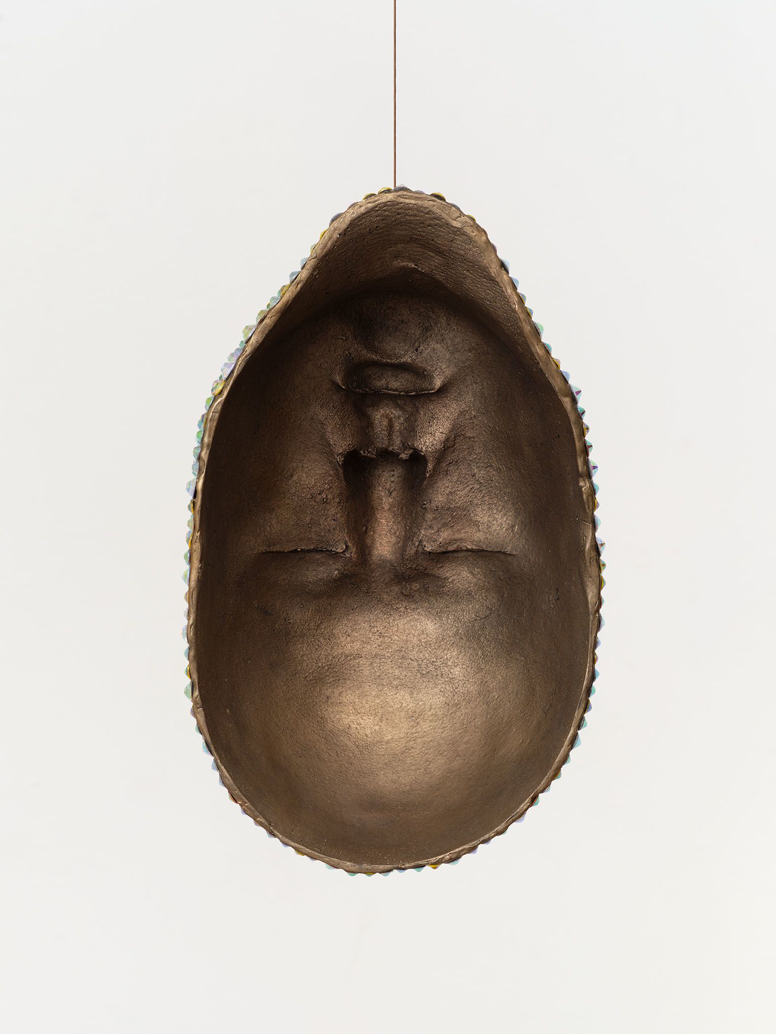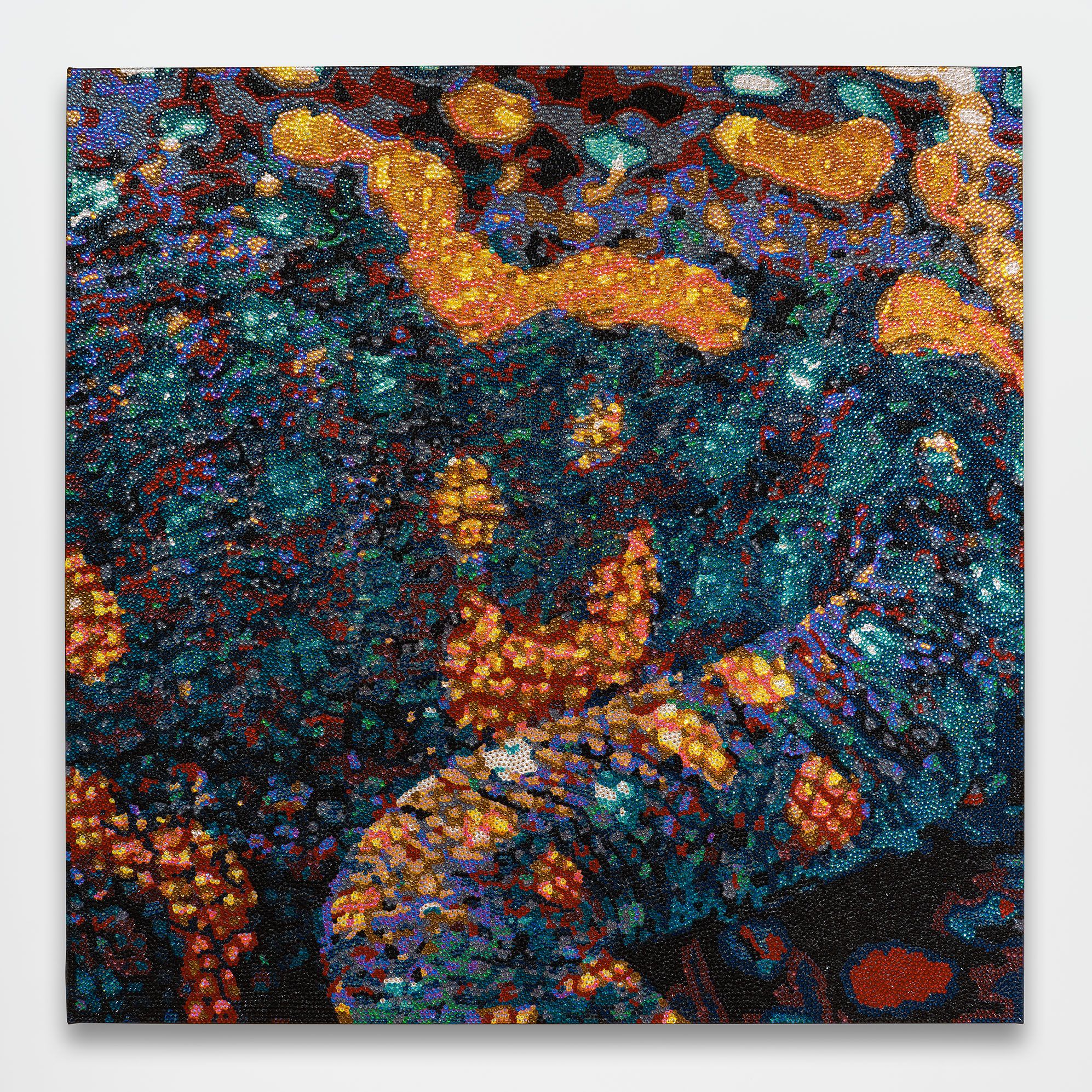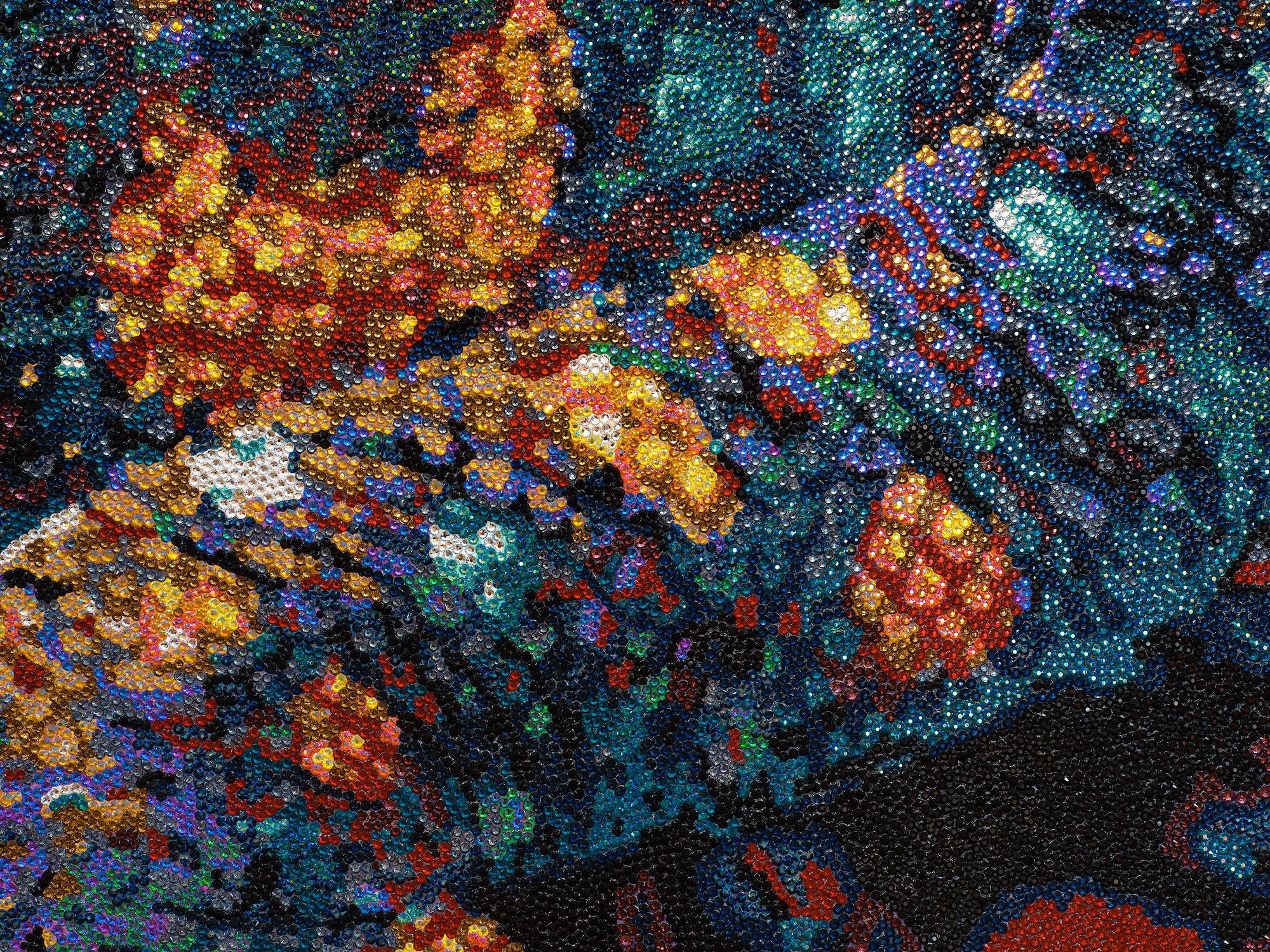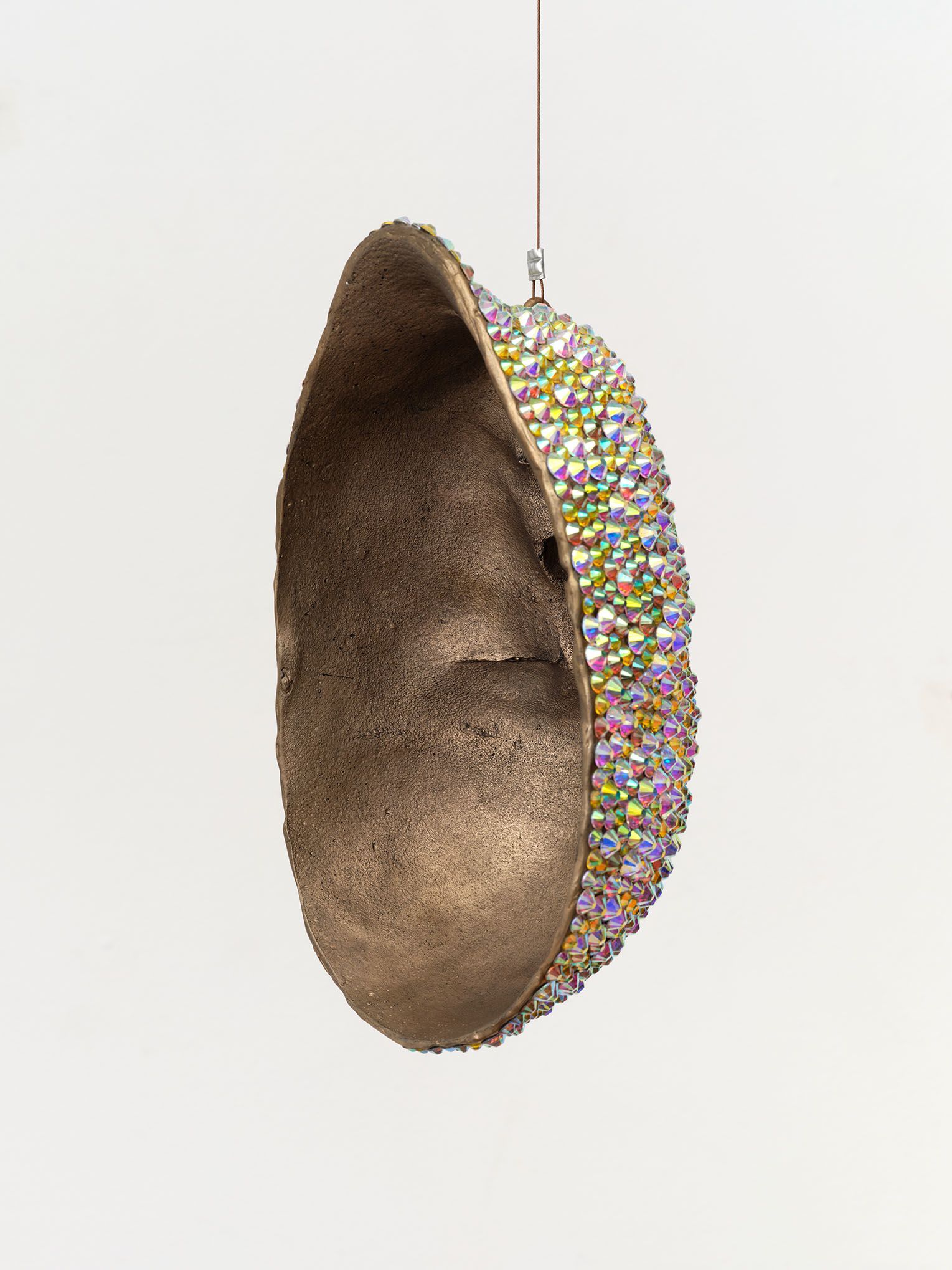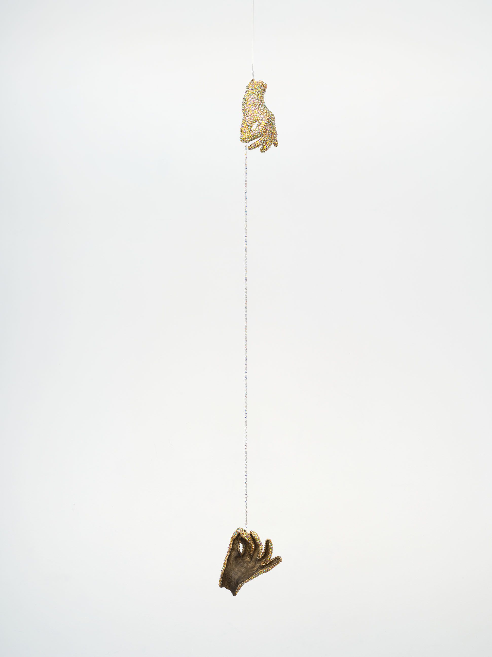 Glitter, resin, glass rhinestones, Swarovski crystal beads, pigmented wax medium, stainless steel cable