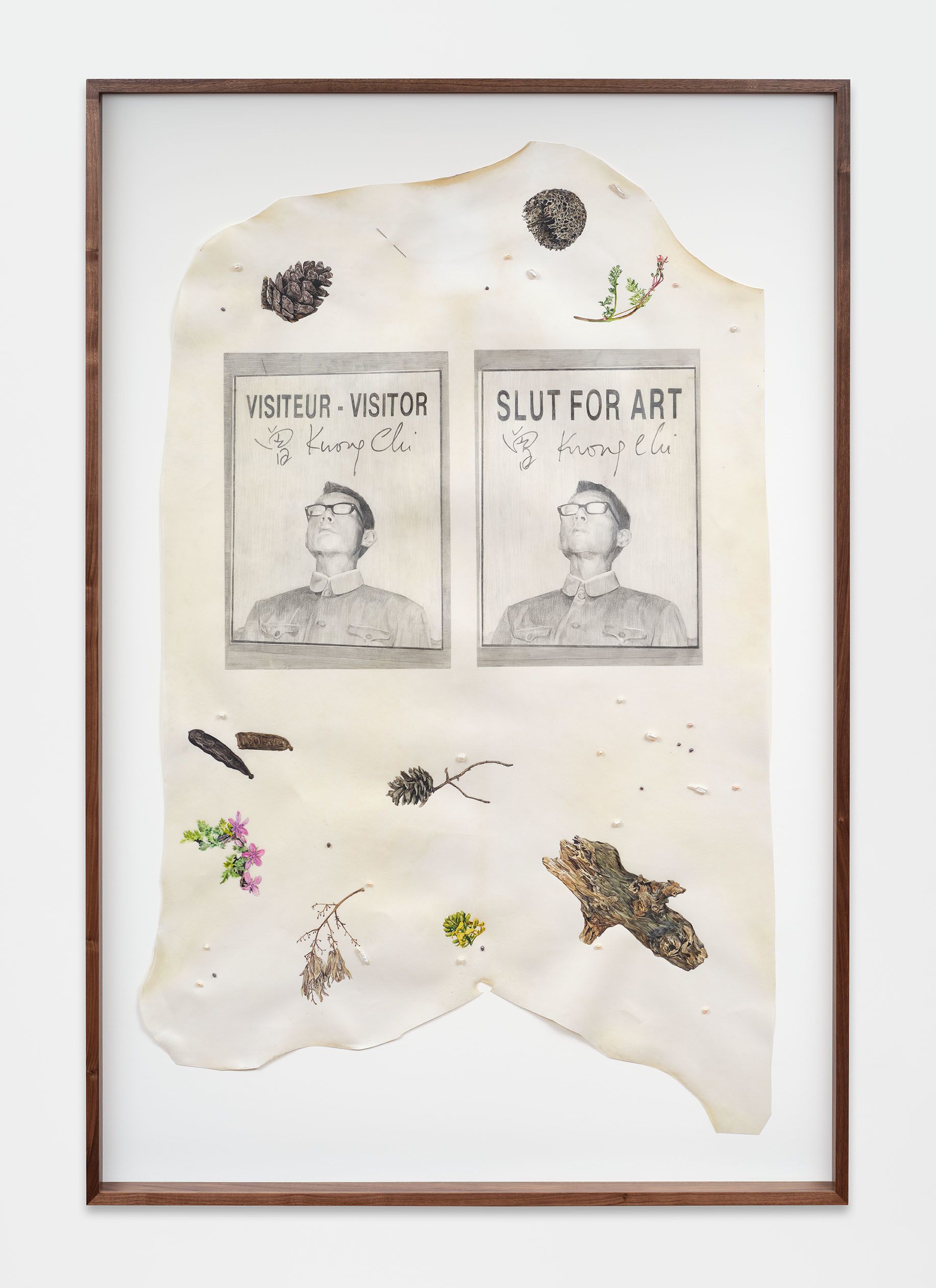 Graphite, watercolor, pearls, piercing needle on goatskin parchment, walnut frame