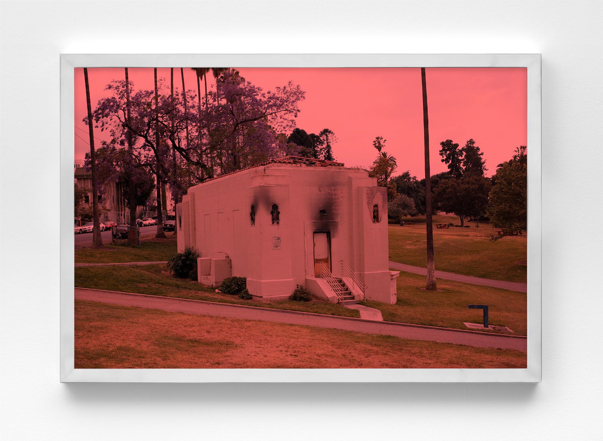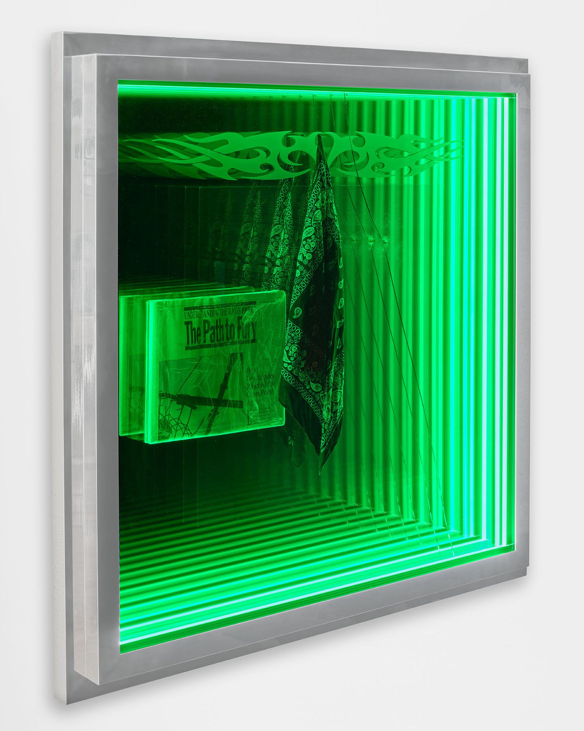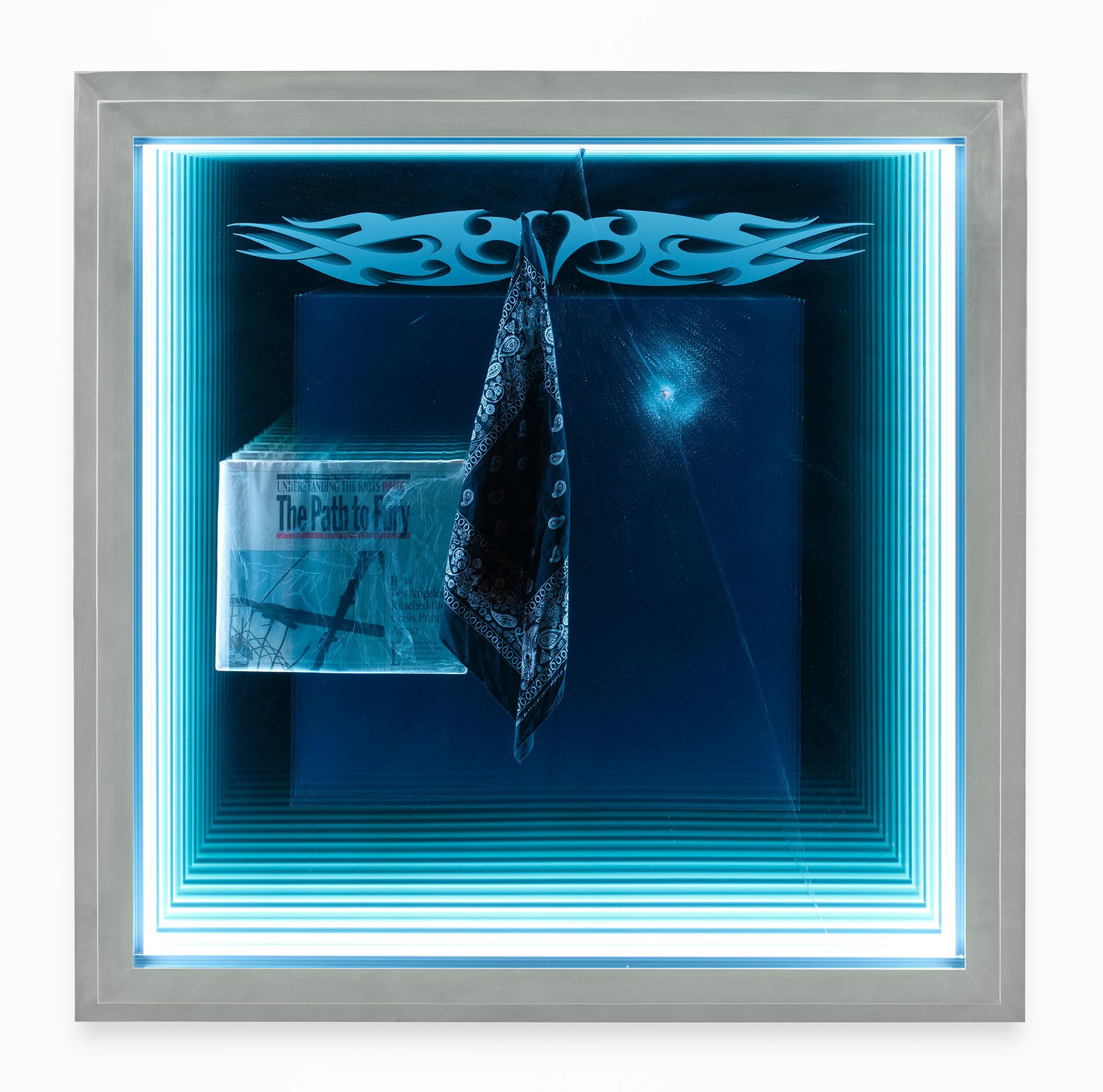 Polished aluminum, glass, mirror, two-way mirror, vinyl decal, bullet, Los Angeles Times newspaper, plastic, bandana, LED lights