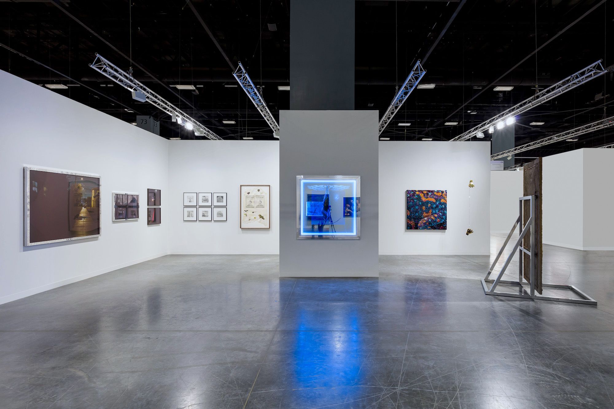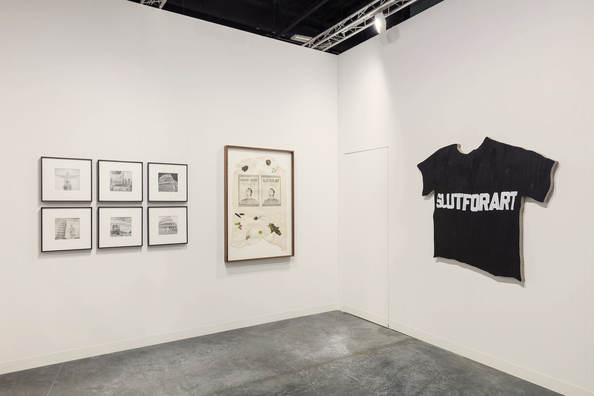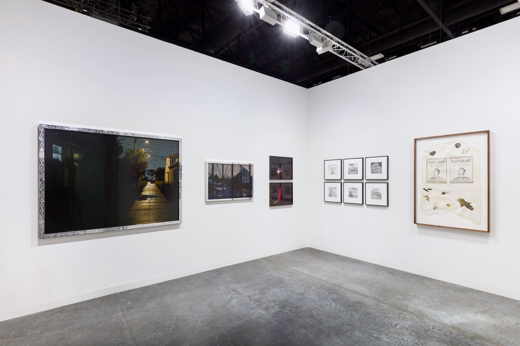 Polished aluminum, glass, mirror, two-way mirror, vinyl decal, bullet, Los Angeles Times newspaper, plastic, bandana, LED lights