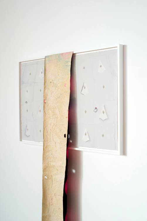 Pencil and gouache on paper, latex, fabric, paint, wood frame